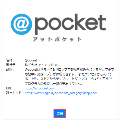 アプリカタログが表示されるので、@pocketの登録ボタンをクリックします。
