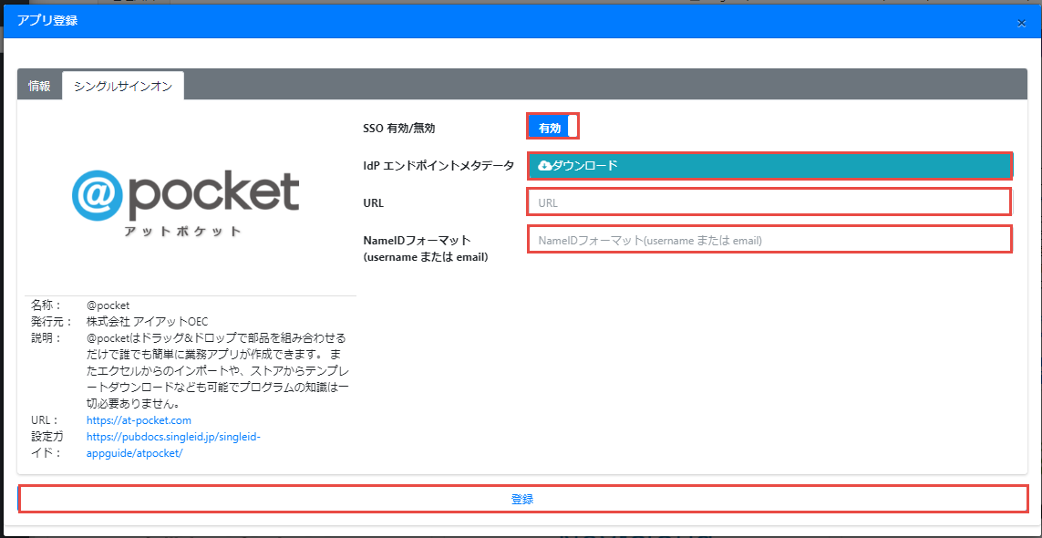 - IdP エンドポイントメタデータのダウンロードボタンをクリックし、メタデータを取得します。このメタデータは、@pocketの設定を行うときに必要となります。