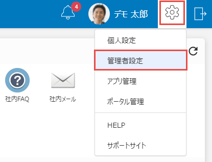 画面右上の設定アイコンをクリックして、プルダウンメニューの管理者設定を選択し、設定画面へ移動します。
