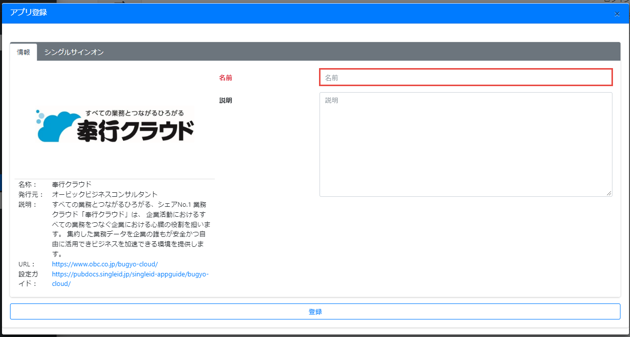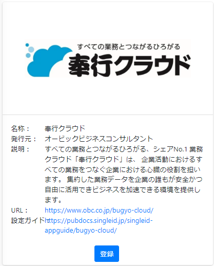 アプリカタログが表示されるので、奉行クラウドの登録ボタンをクリックします。