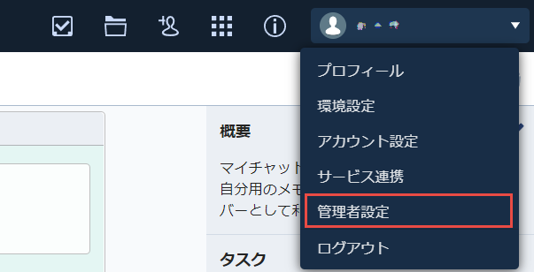 右上のログインユーザをクリックし、管理者設定を選択します。