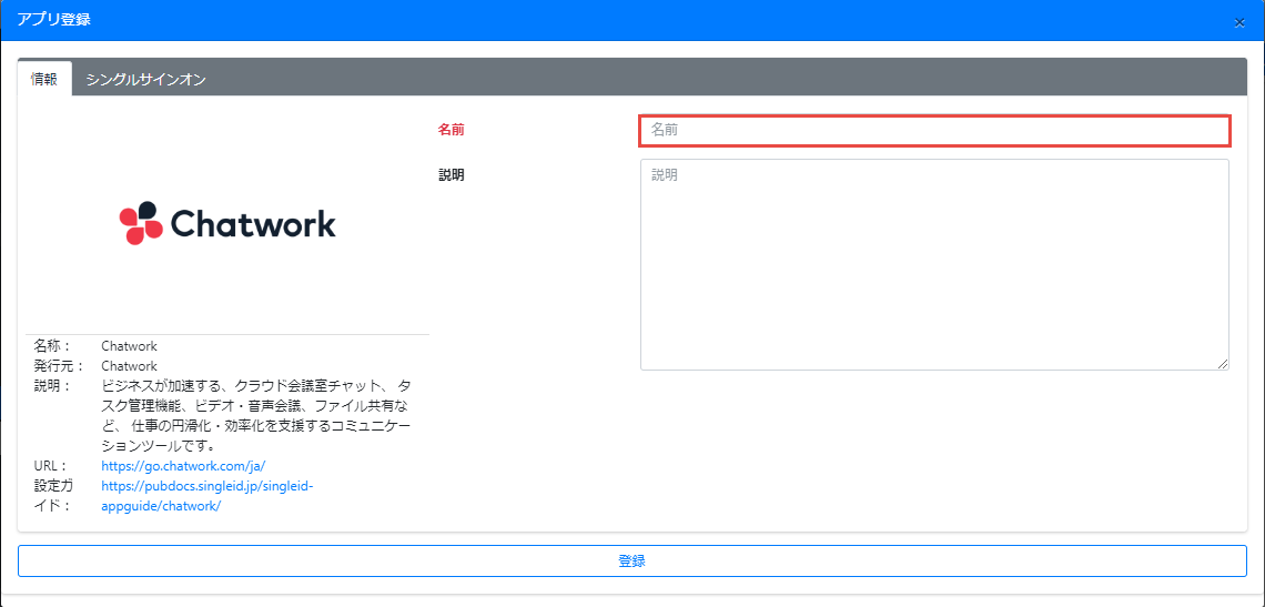 アプリ登録画面がポップアップします。情報タブの名前に、アプリを識別できるような名前を、半角小文字の英数字、-(ハイフン)、_(アンダースコア)で設定します。