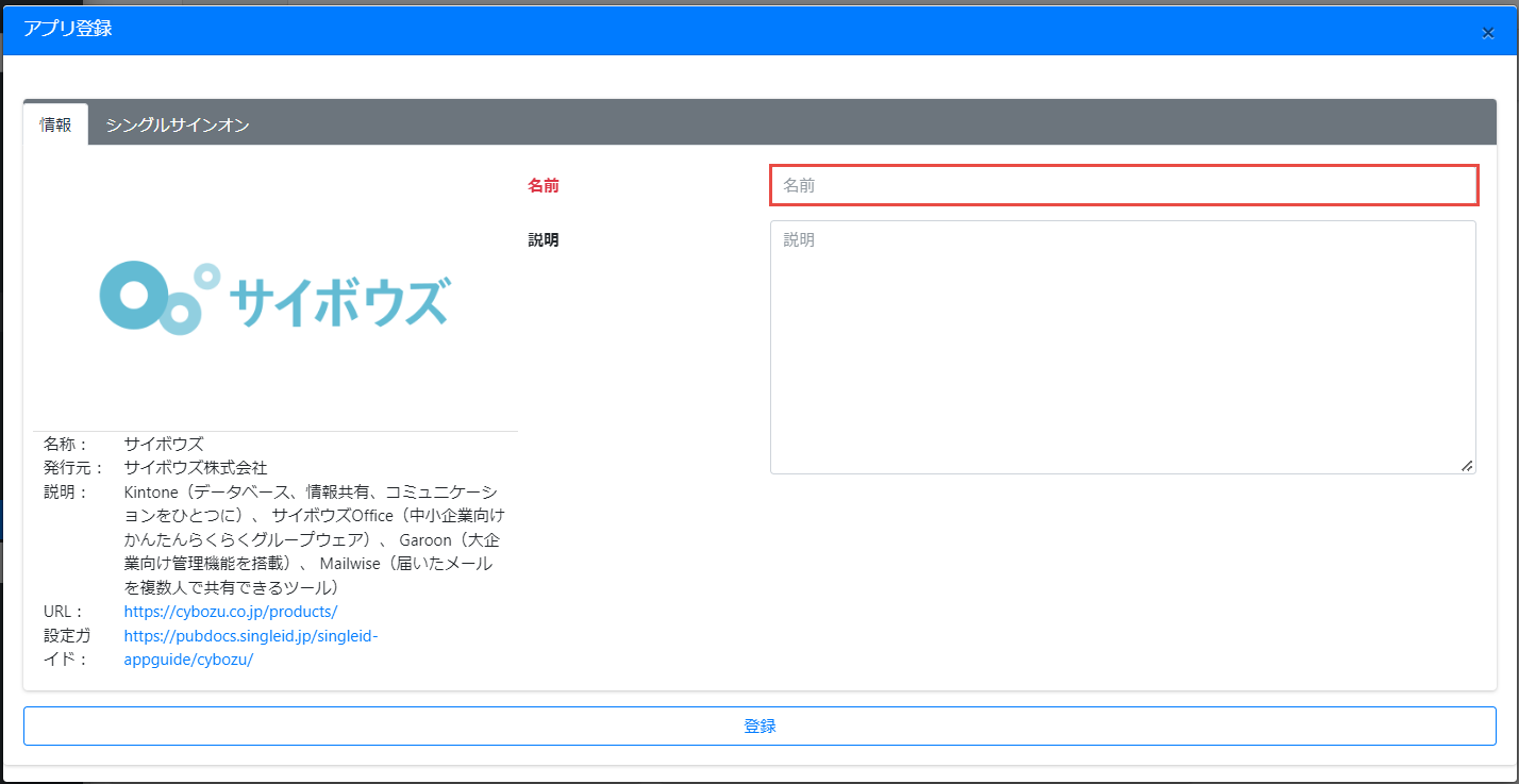 アプリカタログが表示されるので、サイボウズの登録ボタンをクリックします。