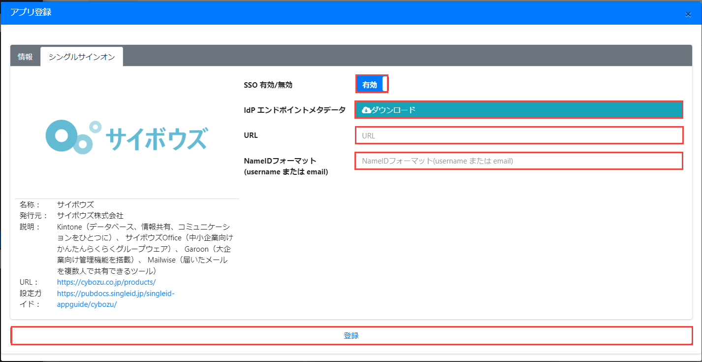 SSO 有効/無効を有効に設定します。