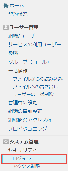 サイボウズの管理ポータル>Cybozu.com 共通管理>システム管理>ユーザー管理>セキュリティ>ログインへ移動します。