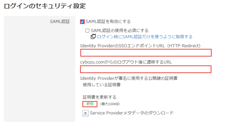 サイボウズの設定項目 設定内容 SAML認証を有効にする Identity ProviderのSSOエンドポイントURL(HTTP-Redirect) PIO-IDのIdPエンドポイントメタデータのファイルを開きます。 <md:SingleSignOnService Binding="urn:oasis:names:tc:SAML:2.0:bindings:HTTP-POST" Location=から始まる行のURLを入力します。