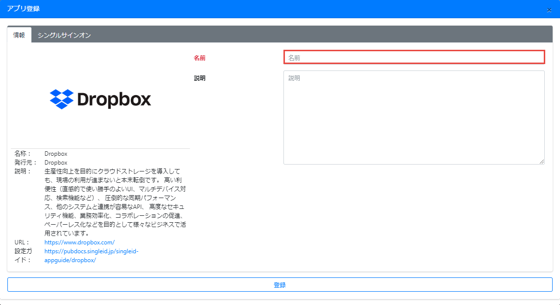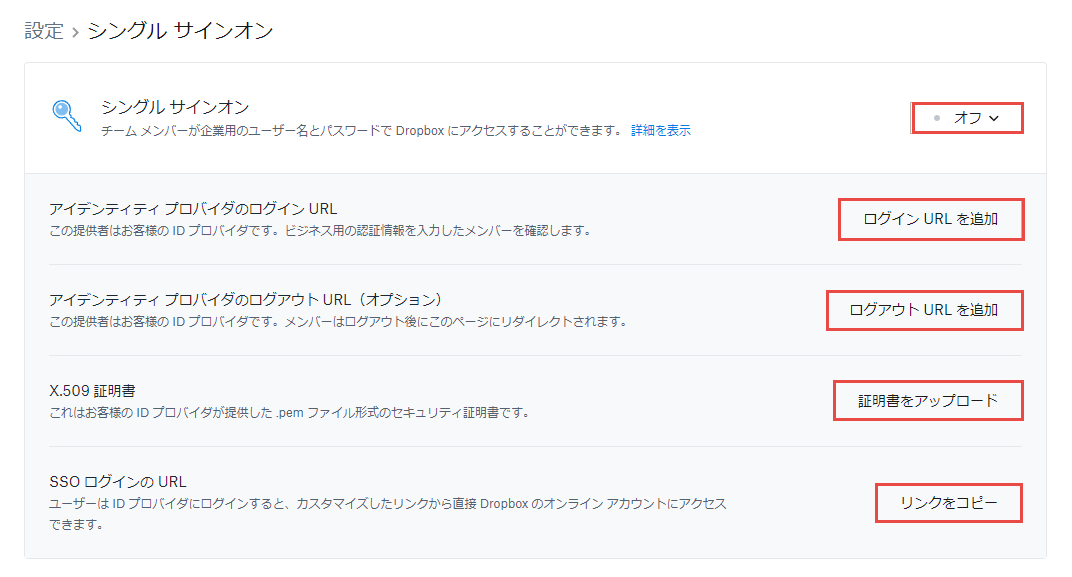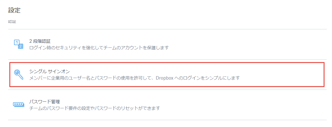 Dropboxの設定項目 設定内容 シングル サインオン 任意または必須