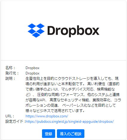 アプリカタログが表示されるので、Dropboxの登録ボタンをクリックします。