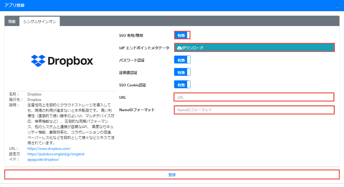 - URLに、DropboxのSAML認証設定の手順5のSSO ログインの URLでコピーした内容を貼り付けます。