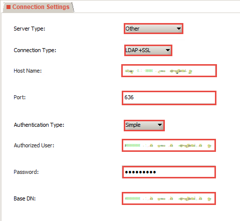 (例:636)Authentication Type Simple Authorized User LDAPサービスアカウントの登録 で登録したユーザ名 Password LDAPサービスアカウントの登録 で登録したパスワード Base DN PIO-ID 管理者ポータル>認証>LDAP>基本情報タブ画面のLDAPベースDNを参照
