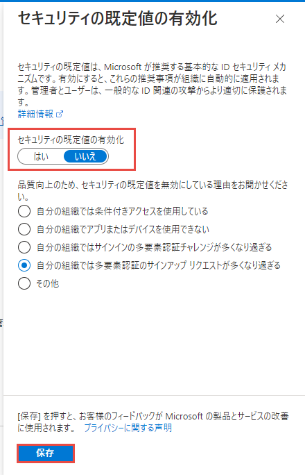 セキュリティの既定値の有効化をいいえを選択し、保存ボタンをクリックします。