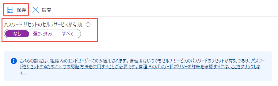 パスワード リセットのセルフサービスが有効をすべてから選択済み(シングルサインオンを実施しないユーザを選択)またはなしに変更し、保存ボタンをクリックします。