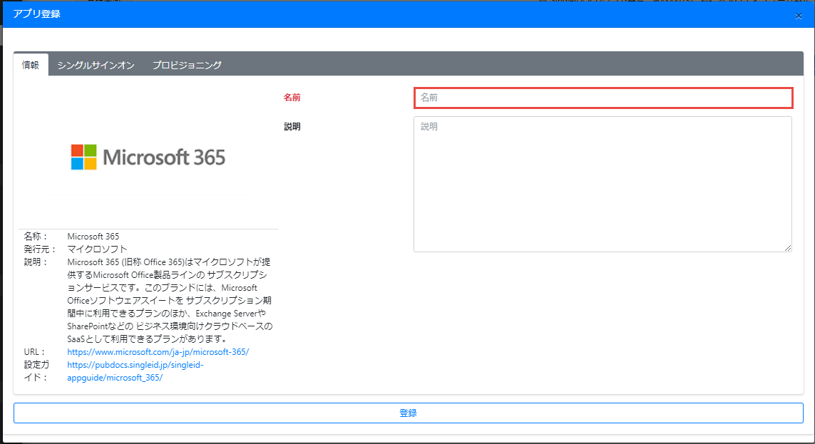 アプリ登録画面がポップアップします。情報タブの名前に、アプリを識別できるような名前を、半角小文字の英数字、-(ハイフン)、_(アンダースコア)で設定します。
