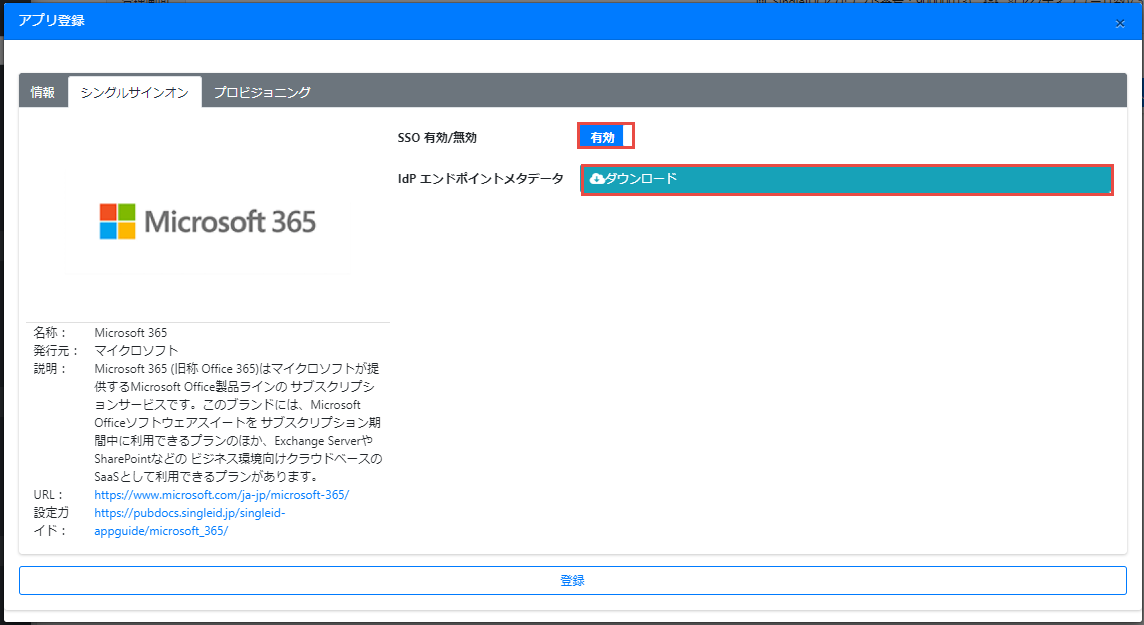 - IdP エンドポイントメタデータのダウンロードボタンをクリックし、メタデータを取得します。このメタデータは、M365の設定を行うときに必要となります。