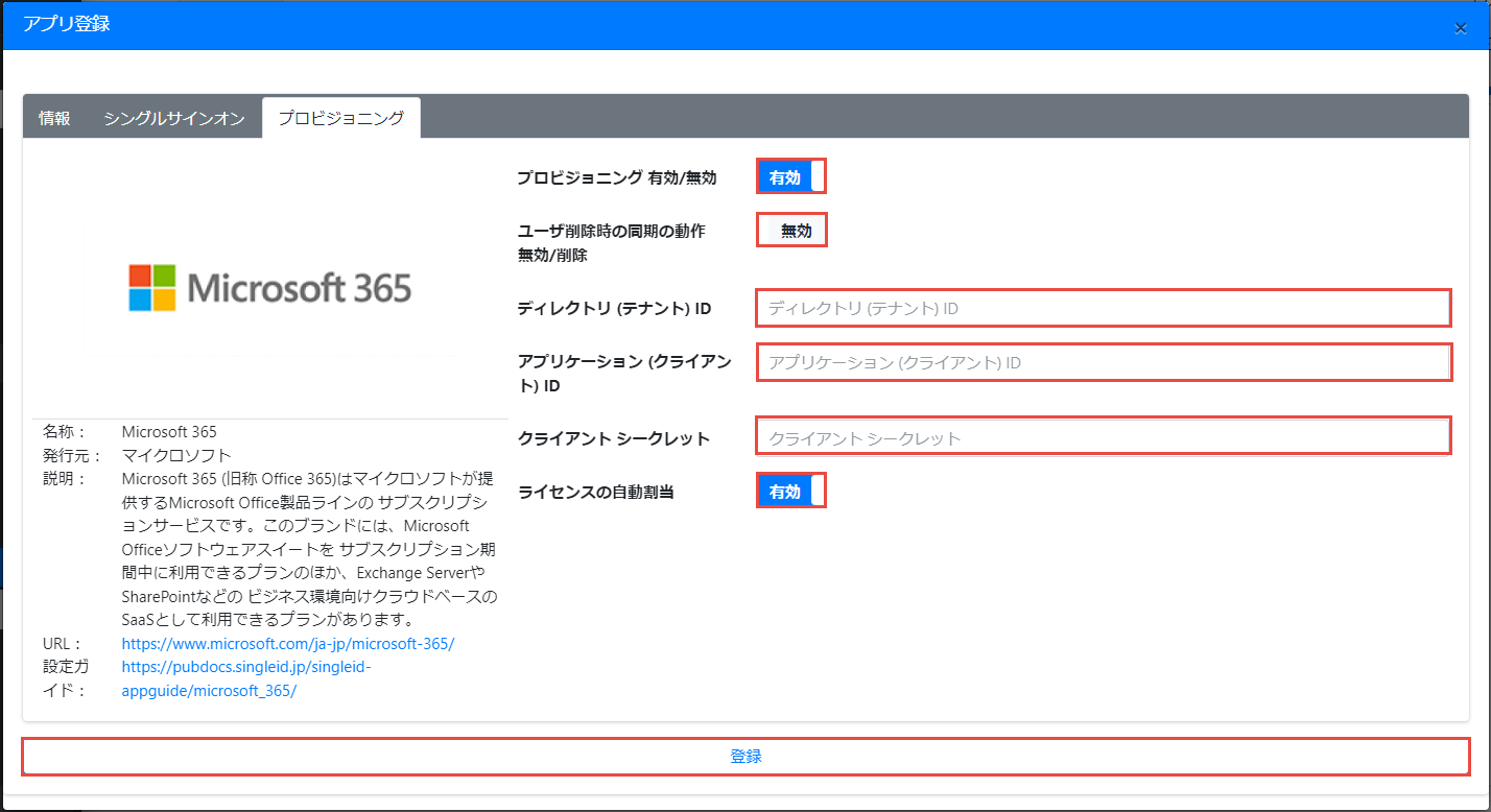 設定項目 設定内容 ディレクトリ (テナント) ID M365のアプリ登録の手順6参照 アプリケーション (クライアント) ID M365のアプリ登録の手順6参照 クライアント シークレット M365のアプリ登録の手順10参照 ライセンスの自動割当 有効(詳細は、自動割当可能なライセンスを参照)