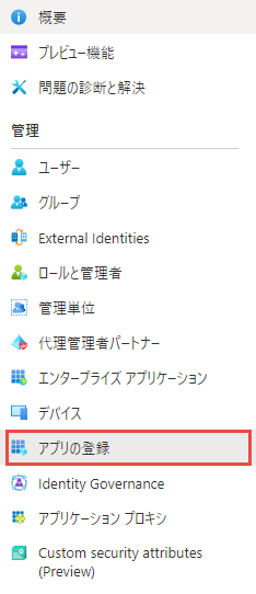 Microsoft Entra IDの名前|アプリ登録の部分をクリックして、Microsoft Entra IDのルートメニューに戻ります。