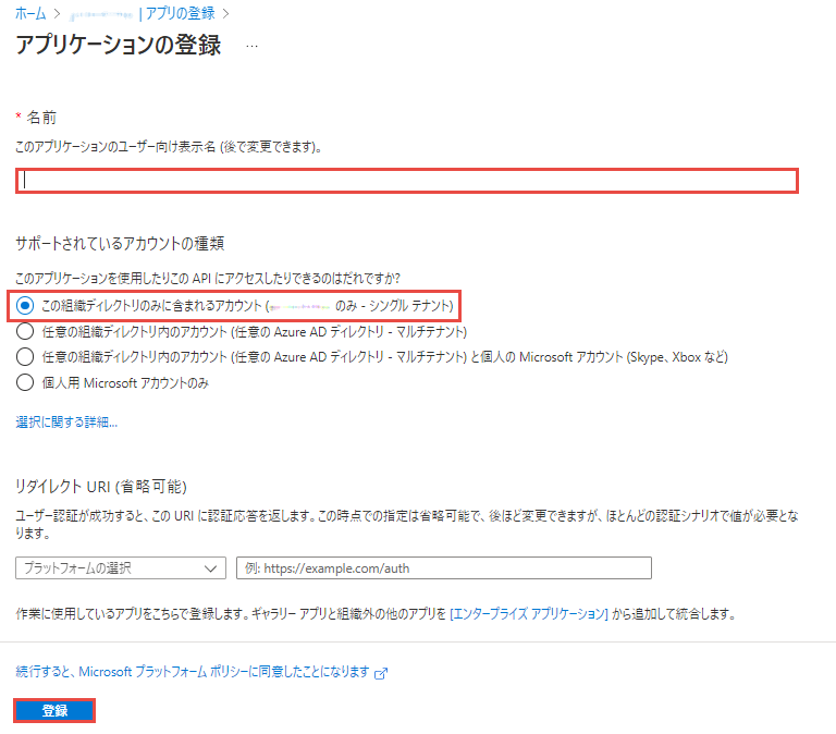 設定項目 設定内容 名前 任意です。(例:PIO-ID) サポートされているアカウントの種類 この組織ディレクトリのみに含まれるアカウント (シングル テナント) -