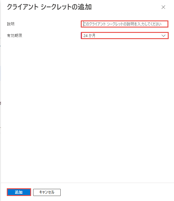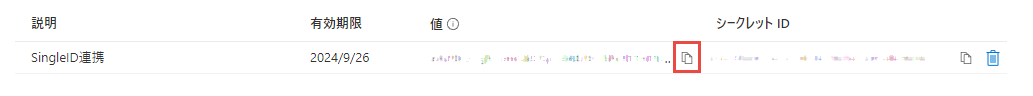 設定に必要となるのは、シークレットの値です。シークレットIDではありません。クライアント シークレットの値は、画面を遷移すると参照できなくなります。値をコピーし忘れた場合には、作成したクライアント シークレットを削除し、再作成してください。