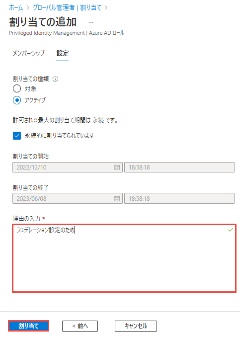 必須項目の理由の入力へ「フェデレーション設定のため」と入力します。割り当てボタンをクリックします。