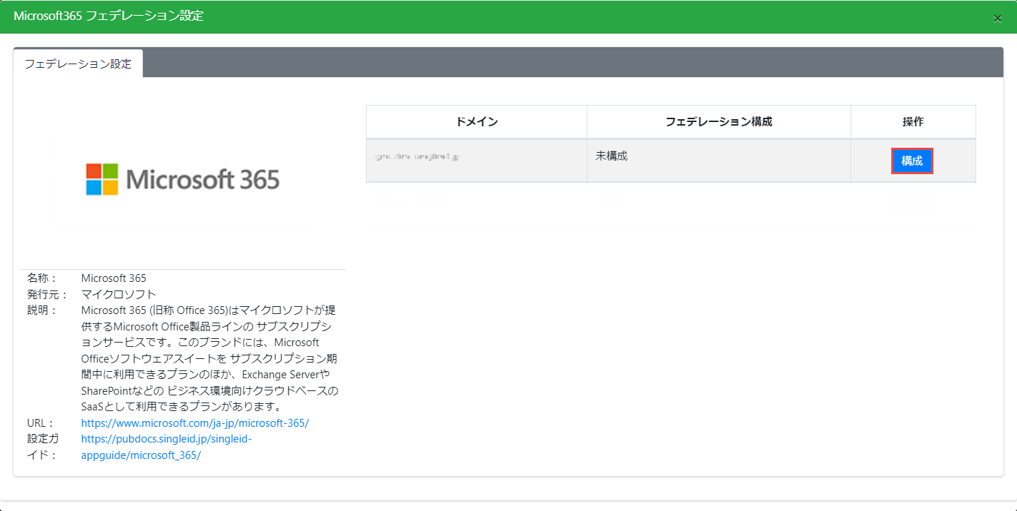 フェデレーション設定を行いたいカスタムドメインの列にある構成ボタンをクリックします。