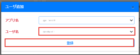 ユーザ追加画面がポップアップします。アプリへ追加したいユーザ名を選択し、登録ボタンをクリックして、アプリへユーザを追加します。