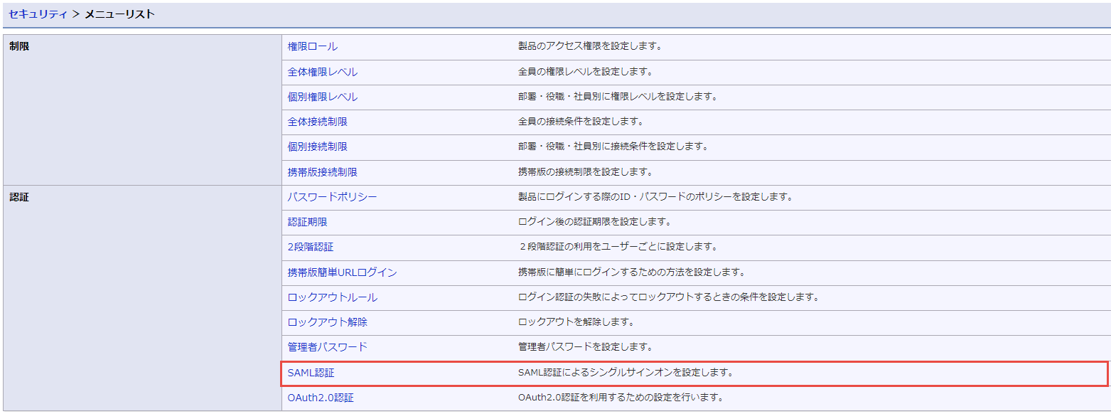 メニューのSAML認証をクリックします。