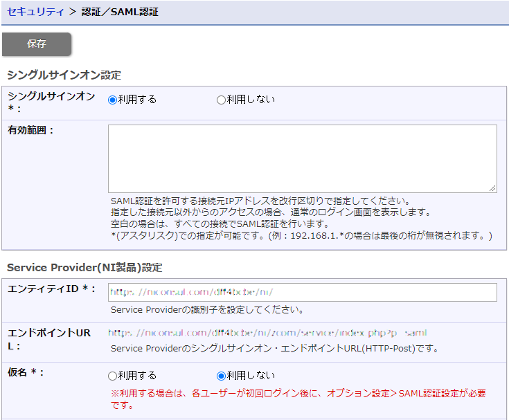 - SPのエンティティIDに、NI Collabo 360のSAML認証設定で設定するエンティティIDを設定します。