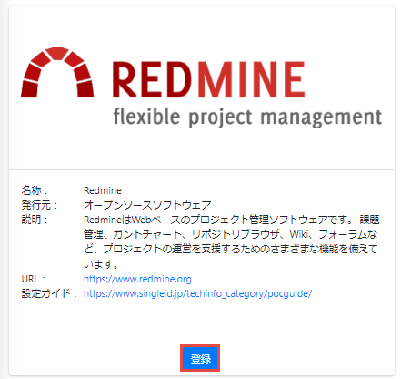 アプリカタログが表示されるので、Redmineの登録ボタンをクリックします。