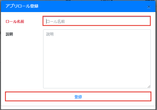 アプリロール登録画面がポップアップします。ロール名として、Redmine Openid Connect pluginのAdmins group (members of this group are treated as admin)に設定したadminを入力し、登録ボタンをクリックして、アプリロールを登録します。