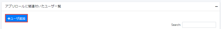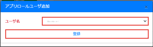 アプリロールユーザ追加画面がポップアップします。adminアプリロールへ追加したいユーザ名を選択し、登録ボタンをクリックして、アプリロールへユーザを追加します。