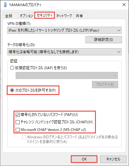 設定項目 設定内容 次のプロトコルを許可する 選択 暗号化されていないパスワード(PAP) チャレンジハンドシェイク認証プロトコル(CHAP) Microsoft CHAP Version2(MS-CHAP v2) Info