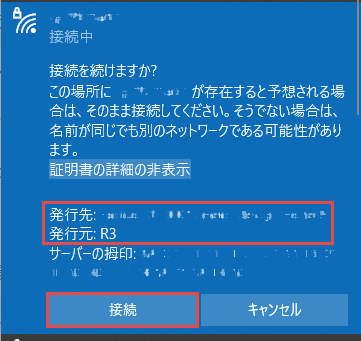 グループ情報の動作を参照して、接続可能な無線LANアクセスポイントのSSIDにのみ接続が成功することを確認します。以下は、接続成功のパターンです。接続を許可していないSSIDには、接続できないことも確認してください。