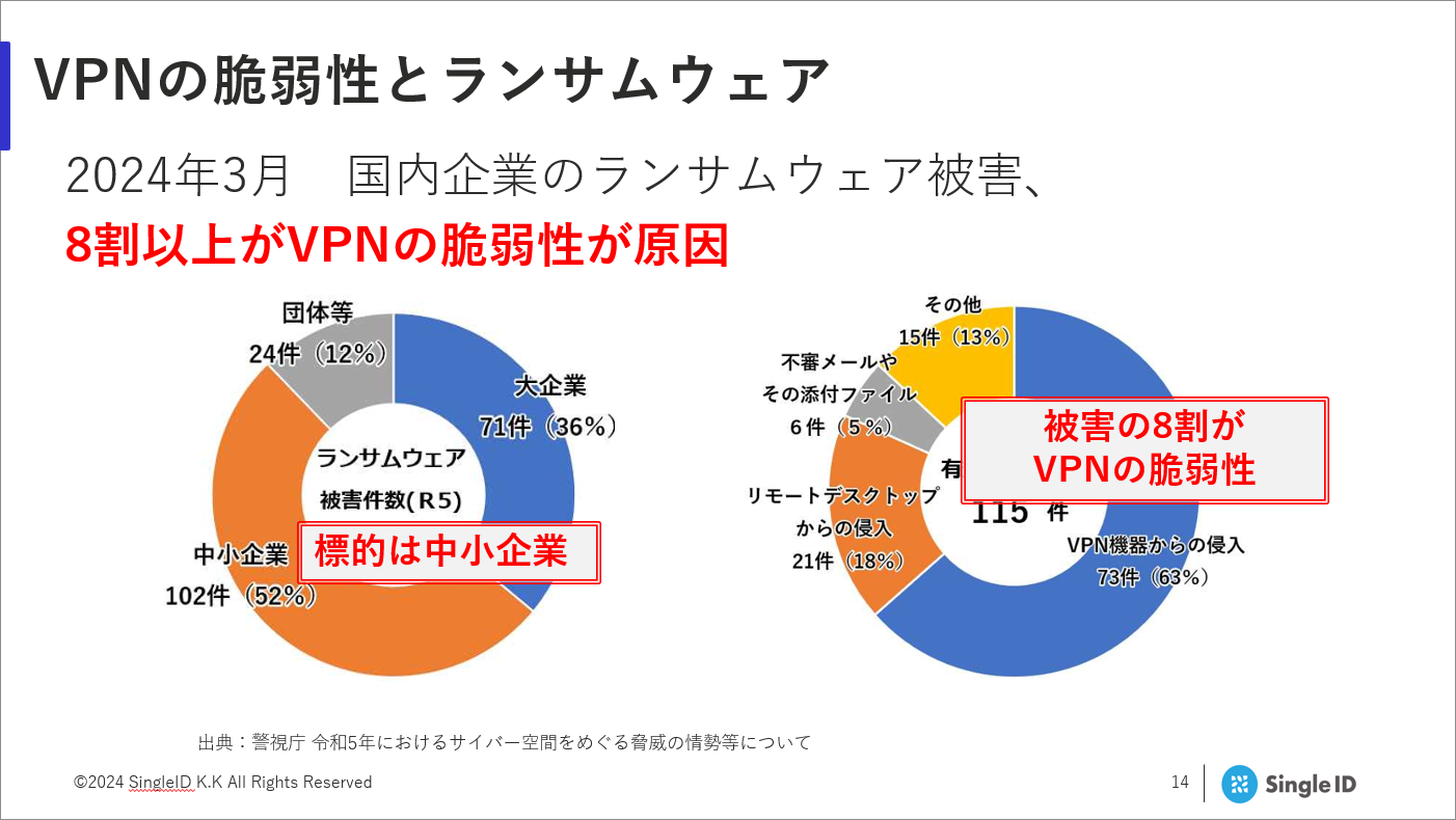 この画像は、リモートアクセスVPNがランサムウェア攻撃の主要なターゲットとなっている現状を示しています。ランサムウェア攻撃の原因のうち、VPNの脆弱性を狙ったものが全体の約8割を占めています。この脆弱性には、以下の要因が含まれます: