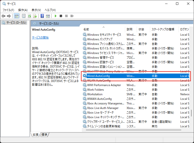 PCのネットワークインターフェースの802.1x認証を有効化する必要があります。Windowsのサービス設定画面からWired AutoConfigサービスをダブルクリックします。