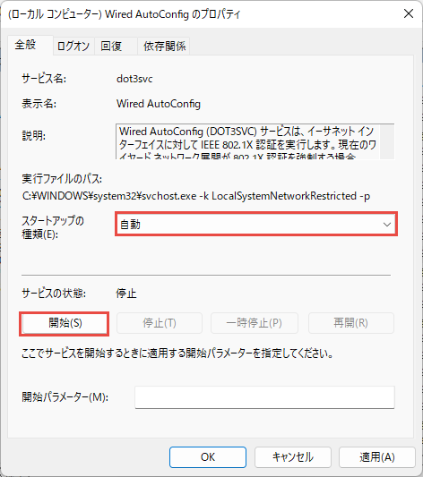 PC起動時に、ネットワークインターフェースの802.1x認証を有効化するために、Wired AutoConfigサービスのスタートアップの種類を自動に変更します。そして、開始ボタンをクリックして、802.1x認証を有効化します。