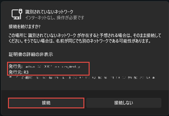 接続先が正しいかどうかの確認を要求されます。証明書の詳しい内容の表示でRADIUSサーバのサーバ証明書の情報が表示されますので、接続先の確認を行います。接続先が正しければ、接続ボタンをクリックします。