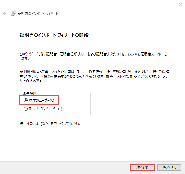 保存場所として現在のユーザーを選択し、次へボタンをクリックします。