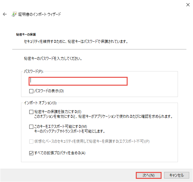 パスワードに、クライアント証明書のパスワードを入力します。クライアント証明書のパスワードは、ユーザ名(参照)と同一です。次へボタンをクリックします。
