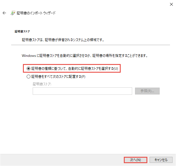 証明書の種類に基づいて、自動に証明書ストアを選択するが選択されていることを確認し、次へボタンをクリックします。
