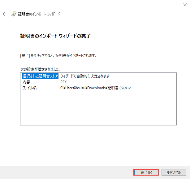 完了ボタンをクリックし、証明書をインストールします。